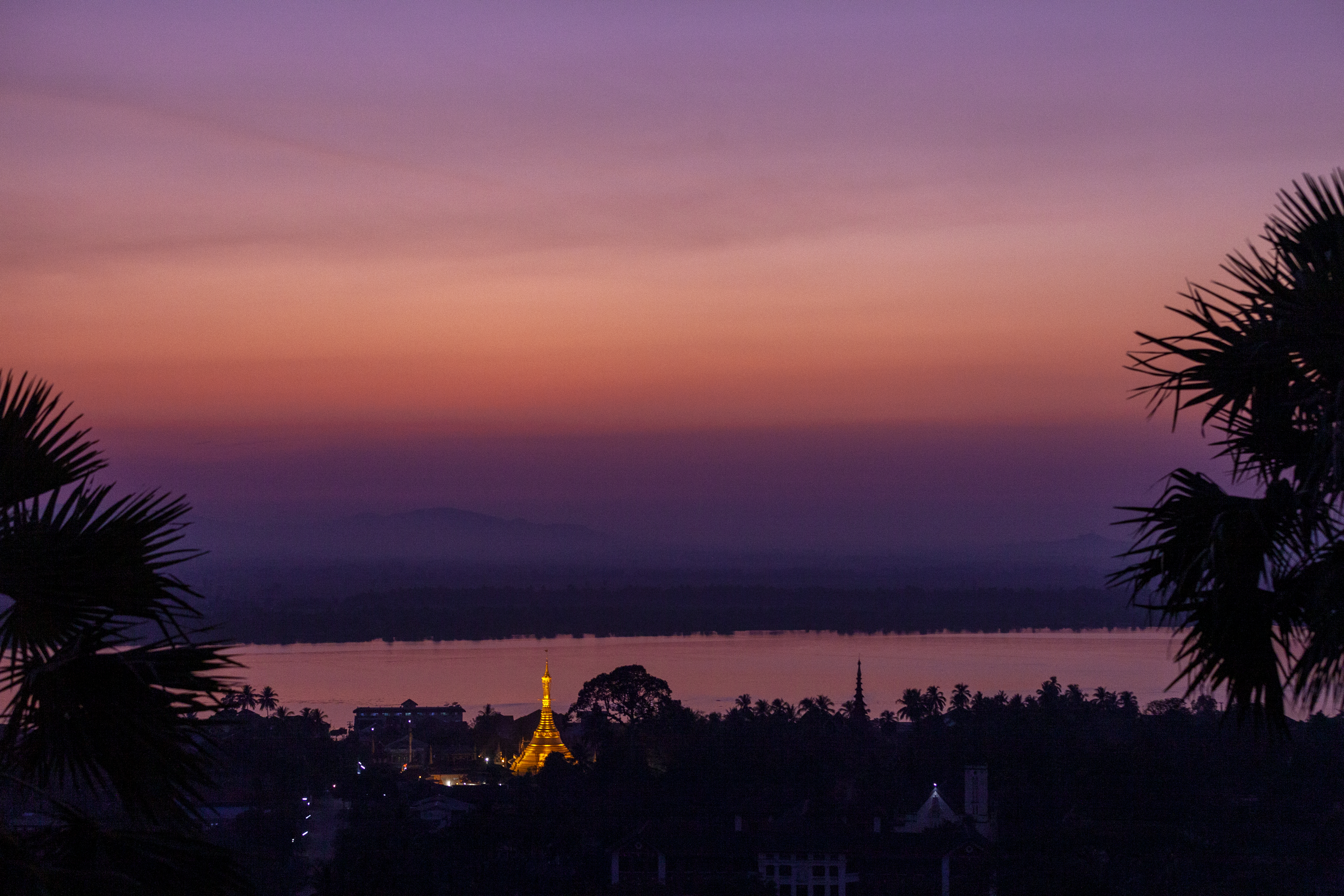 A large pagoda dominates the skyline at sunset above Moulmein, Myanmar.