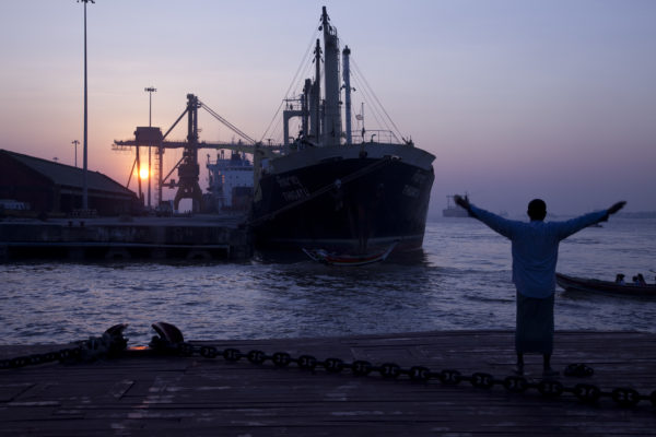 Boats that serve as taxis help passengers board on the banks of the Irrawaddy River in Yangon, Myanmar.