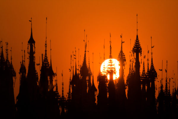 Pagoda spires are silhouetted against the setting sun at Kakku Pagoda in Myanmar.