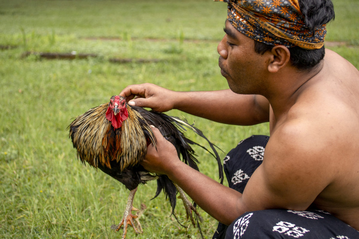 A man holds his rooster before a cock fighting at Lake Tamblingan in Bali, Indonesia.