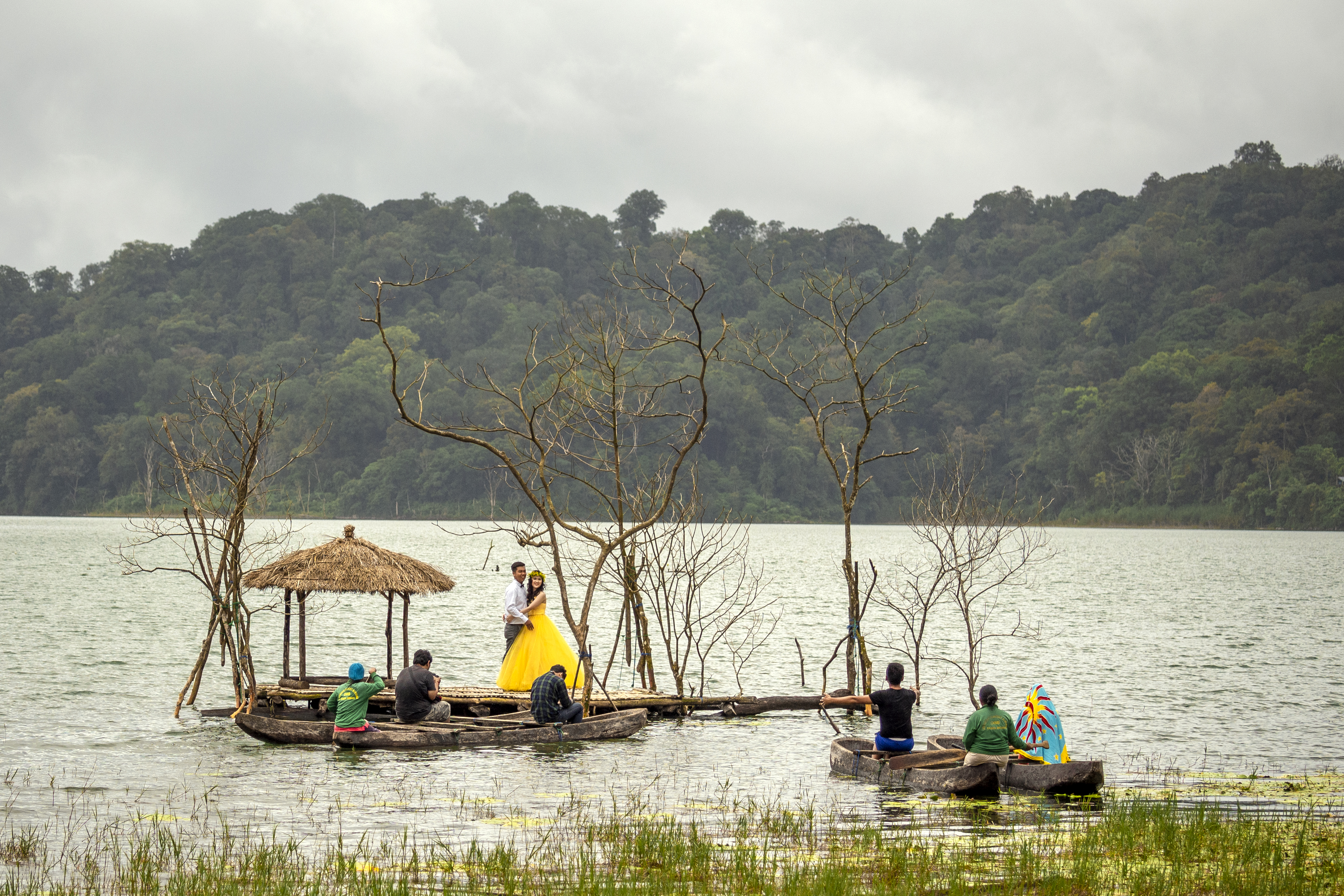 An Indonesian couple has formal portraits made on scenic Lake Tamblingan in Bali, Indonesia.