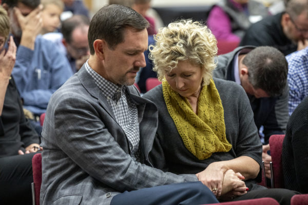 Paul and Michelle Chitwood close their eyes in prayer during a church service in Uganda. The Chitwoods traveled to Uganda to witness and take part in the ministry of IMB missionaries serving in the country.