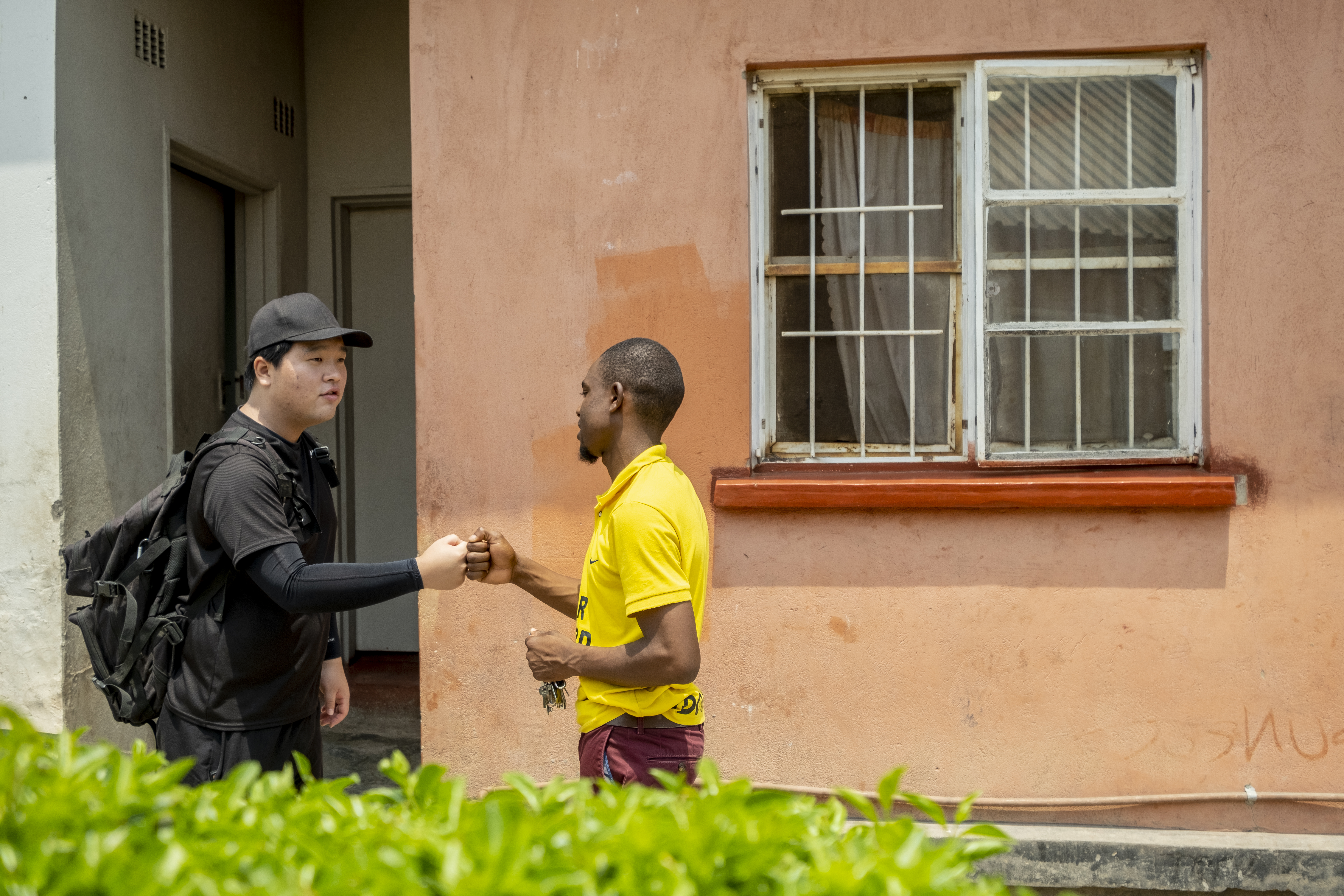 Min Jae “Danny” Kim (left), greets a friend he has been witnessing to in Zambia. Kim served as a global missionary partner on an IMB team. Global missionary partners help to multiply the work of career missionaries. IMB Photo