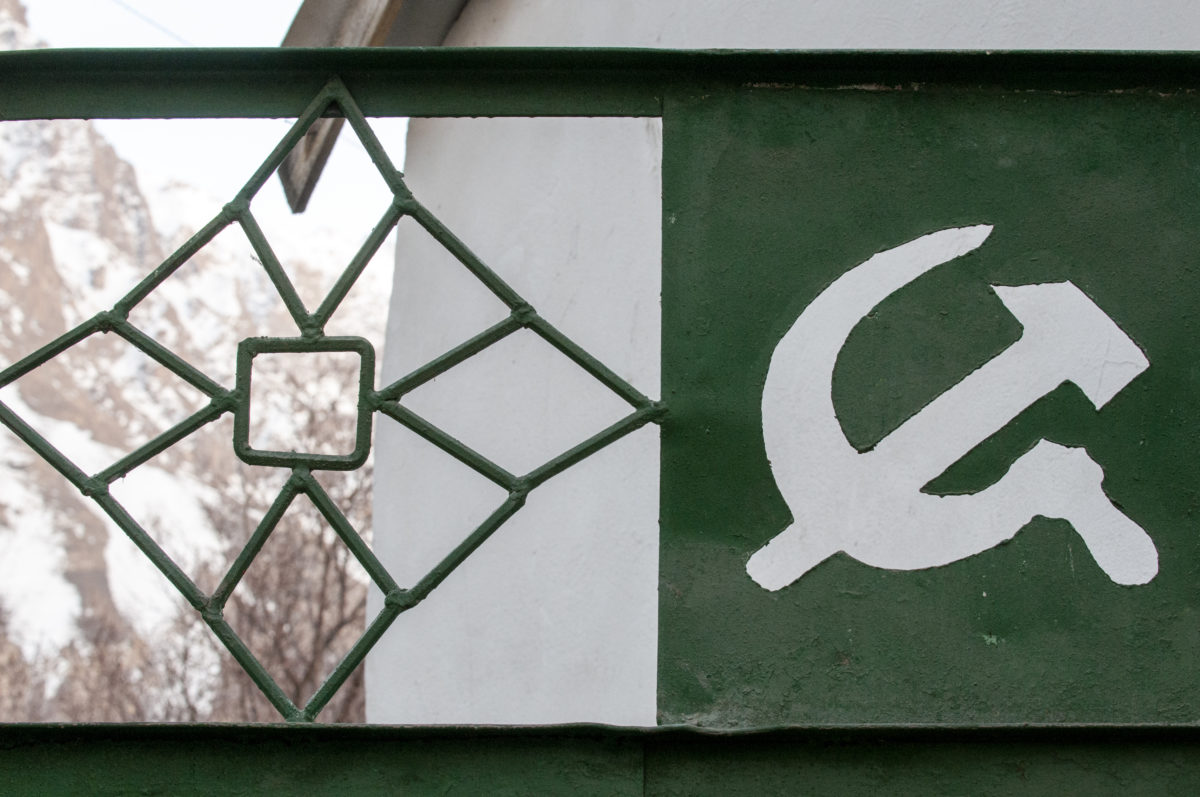 The Soviet symbol, a hammer and sickle, etched on a gate in Khorugh, Tajikistan. The government in Tajikistan is trying to remove Russian influences in the country, such as by changing street names from Russian names to Tajik ones.