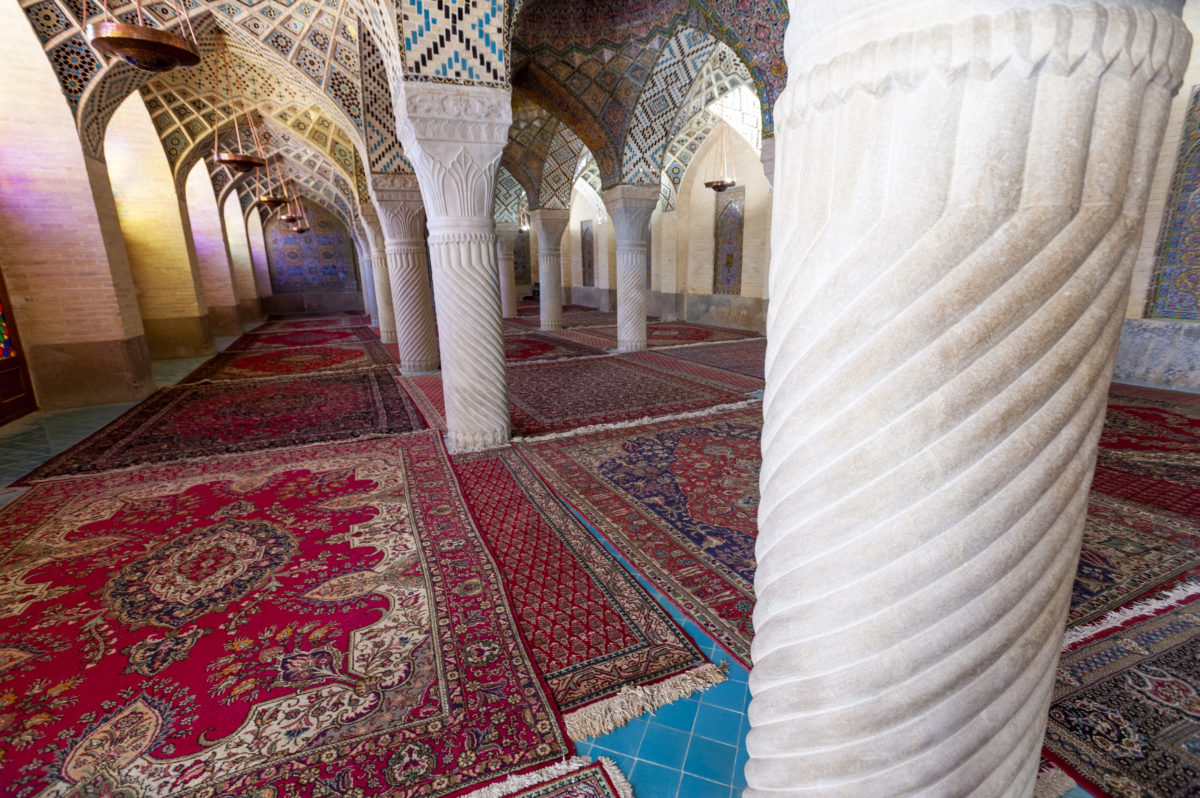 An interior prayer room with Persian carpets spread across the floor at the Nasir-ol-Molk Mosque, also known as the Pink Mosque in Shiraz, Iran.