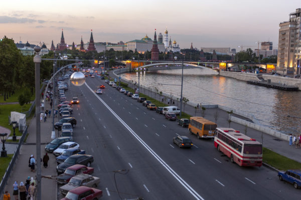 Russia’s Kremlin is a fortified citadel overlooking Red Square in downtown Moscow, Russia. The Kremlin can be seen in the distance from this shot taken just outside the Cathedral of Christ the Saviour.