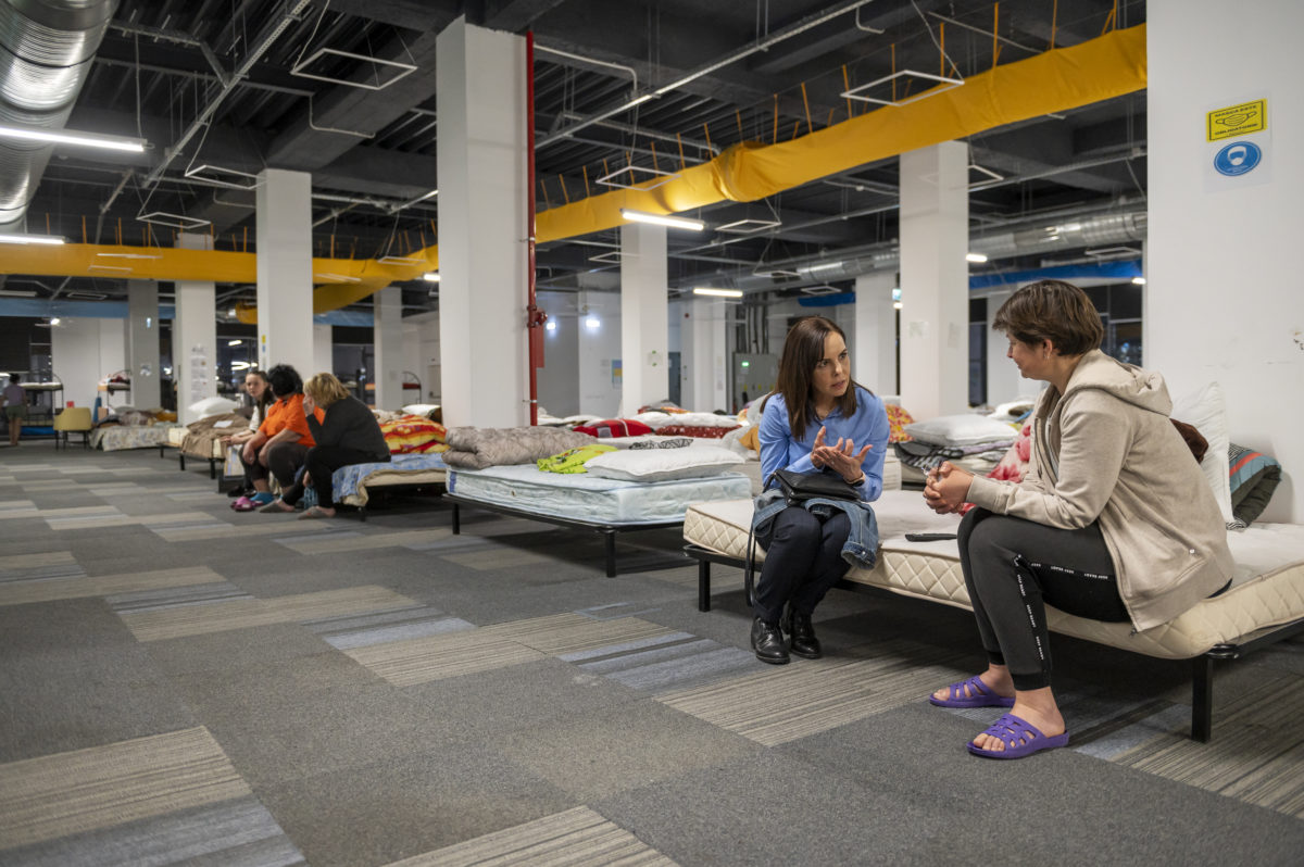 A Send Relief team visits a Ukrainian refugee center in downtown Iasi, Romania. An office building is being used to accommodate refugees temporarily. Ginny Wheeler, center, talks with a Ukrainian refugee staying at the center. Wheeler is involved with Send Relief efforts. IMB Photo