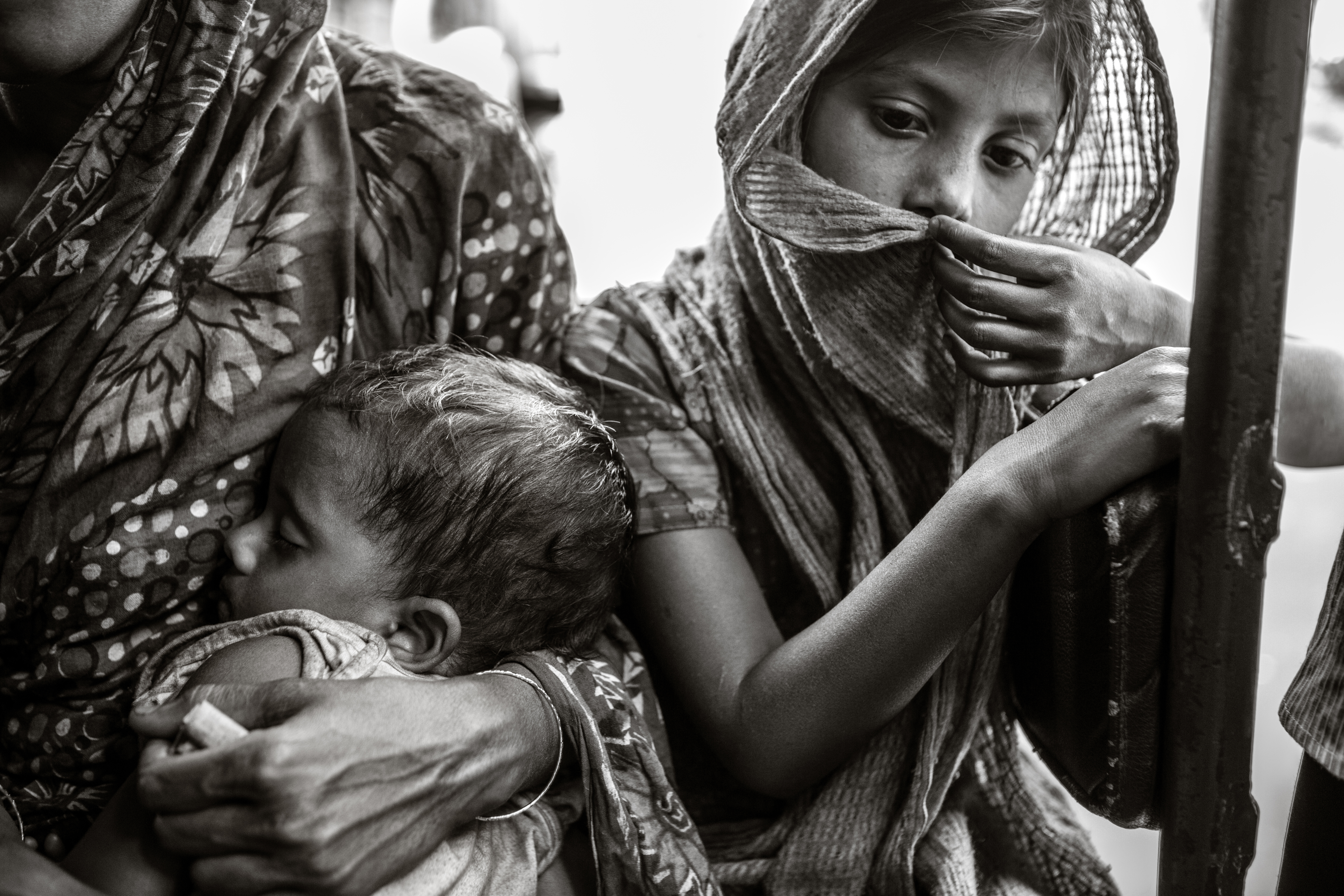 A mother fixes her daughter’s hair in their home in a slum in South Asia.