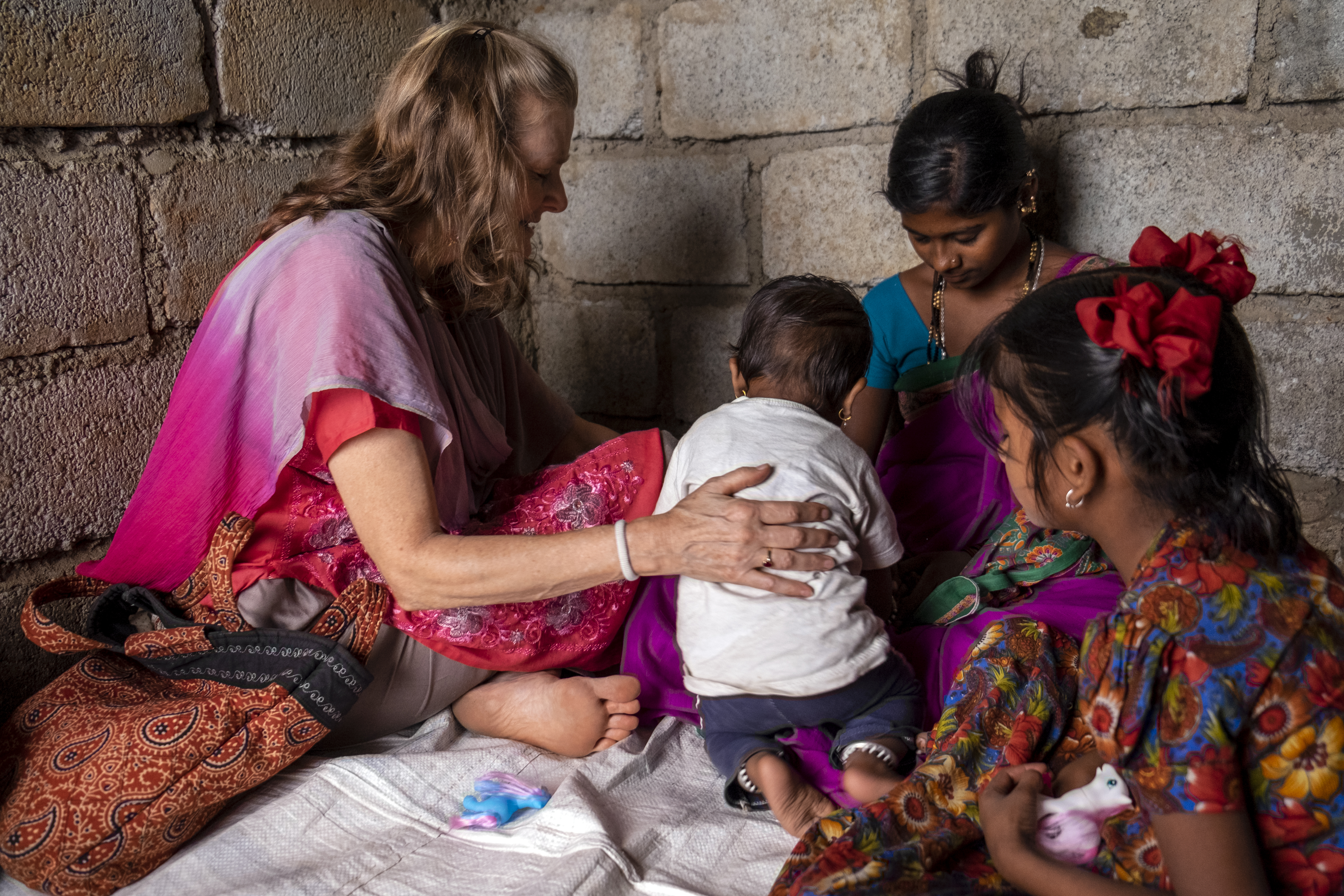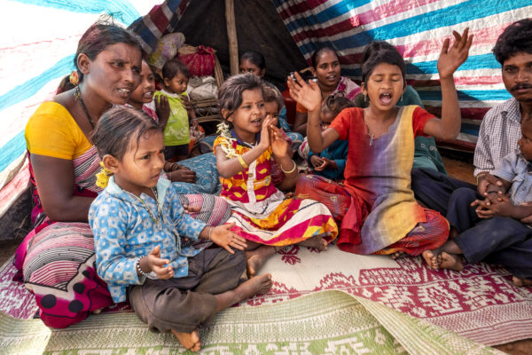 An IMB missionary leading an outreach activity in a tent camp in South Asia.