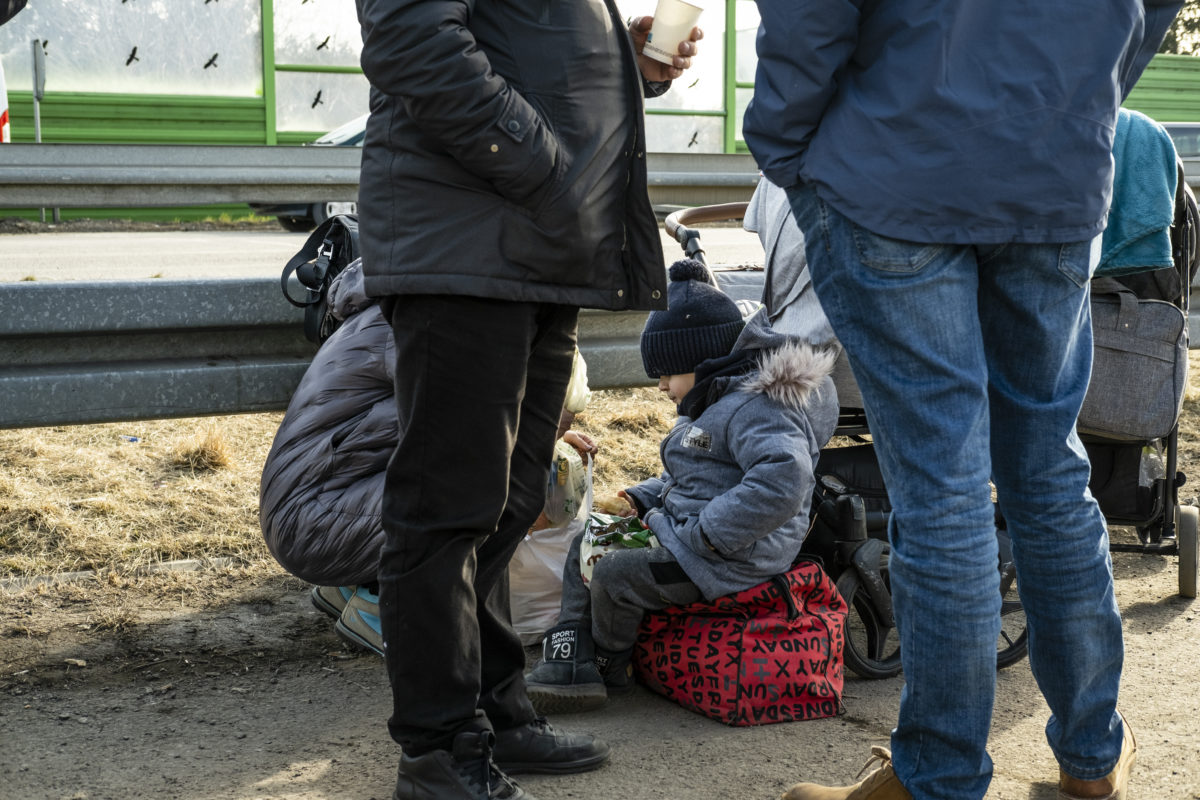 Ukrainian refugees – mostly women and children – huddle in the cold with their luggage at a border crossing near Chelms, Poland. In Feb. 2022, Russian forces invaded Ukraine causing a massive movement of refugees into bordering nations as well as Internally displaced peoples within. IMB Photo