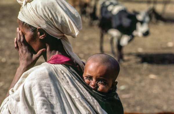 A mother struggles through the parched Ethiopian highlands hoping to find food and medicine for her child at the Southern Baptist feeding and health care center at Rabel. Her husband died along the way. During the Ethiopian famine, some 7,000 starving men, women, and children made their way to the feeding station during its first three weeks of operation in 1985. The station was the most remote feeding center in the country. By mid-year, Southern Baptists had opened five feeding stations in the Menz-Gishe and Marharbeti areas, where they distributed grain to thousands and provided medical care.